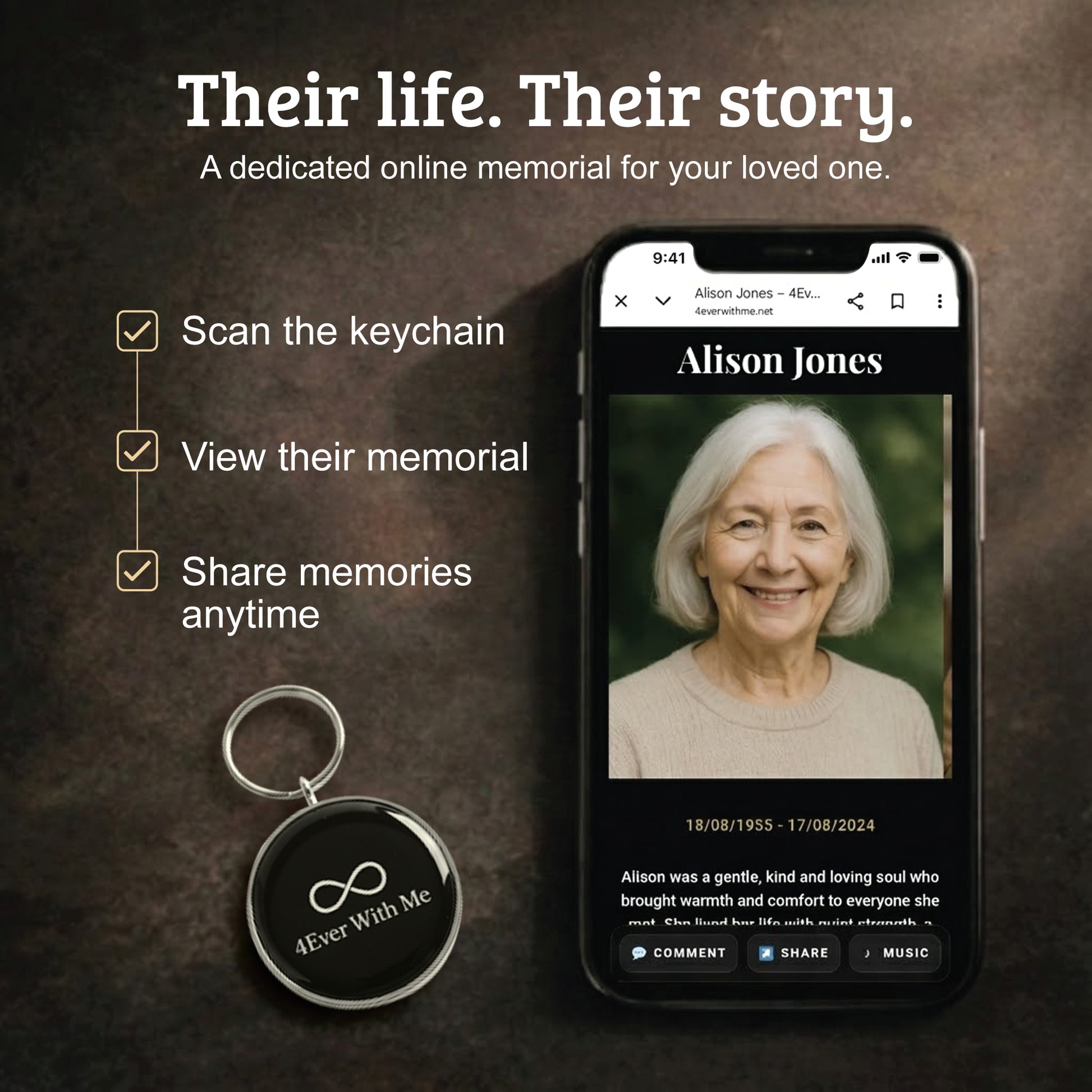 The4Ever With Me Memorial Keychainis a beautifully crafted keepsake that connects to a personalised digital memorial page. It allows you to store and share photos, stories, and memories to celebrate the life of someone special.