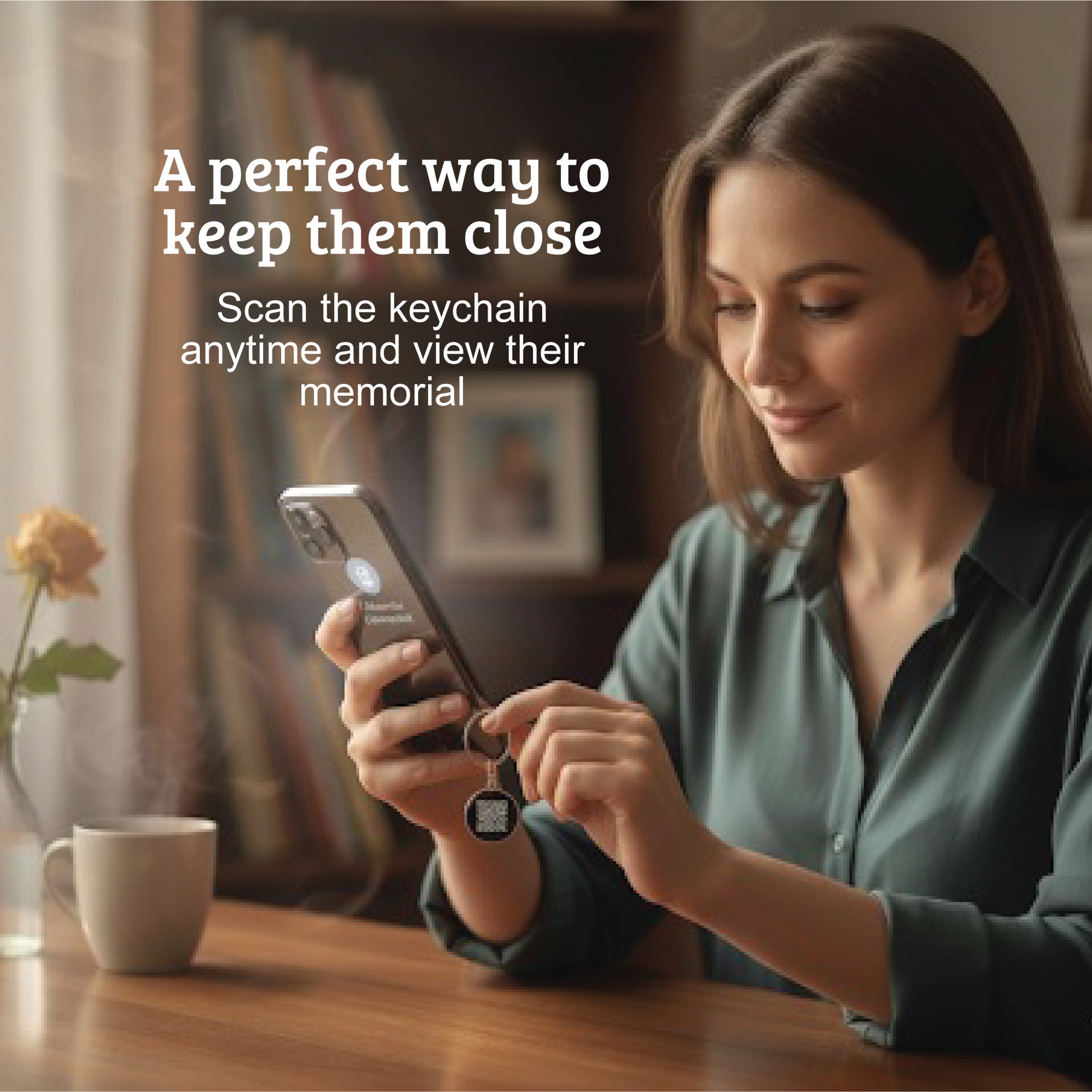 Simply scan the keychain to view their dedicated page, share new reflections, or listen to their favorite music. Thoughtfully designed to bring comfort, connection, and remembrance wherever life takes you.